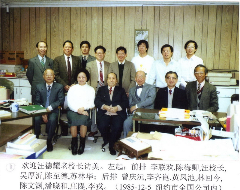 1980年,我于服务台湾水泥界30年后,得美国宾州富乐公司之聘前来工作,并移民美东。1987年之某日,忽得厦大美国校友会(按:若干年后改名为“美洲校友会”)理事长吴厚沂学长通知,嘱于该星期天到纽约金国食品公司聚会,欢迎到美访问的汪德耀老校长,闻讯欣喜异常,因这是我离校近40年后得以重谒汪公之时也。我遂于该日自宾州开车,先到新泽西州我级友李齐昆兄之家,换乘他的大车由他开往纽约市区。不久从美东各州赶到之校友已齐,遂在金国公司3楼会计室整理好场地,而有14人(在场者为:汪校长、吴厚沂、陈梅卿、李联欢、陈至德、苏林华、曾庆沅、李齐昆、黄凤池、林回今、陈文渊、潘晓和、庄堤、李戎)之合照,今附此。