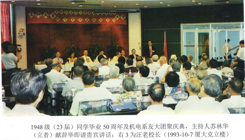 到了1998年的10月,我们1948级举行毕业50周年庆典,且与老机电系第二次大团聚之会合并举行,称为两会之庆,并公推我为开幕式的主持人,在克立楼三楼会议室举行。坐于主席台上之贵宾有八位,汪老校长与林祖赓校长居中,两侧分别是校友总会陈孔立理事长,美国吴厚沂、泰国蔡悦诗、台湾丁世杈、菲律宾邵建寅,均是各分会主持人;另萨前校长公子萨支唐因有急电外出。我献辞时,首先代表两会向汪老校长致敬,然后才向林祖赓校长及其它贵宾致意;林校长循例先行致辞后,便是汪公讲话,他除对本级致贺外,特别对其时大贪污的北京市长陈希同予以痛斥,并认为田汉的《义勇军进行曲》改成中国国歌后,其歌词应配合时代予以修改,令人感到很特别。