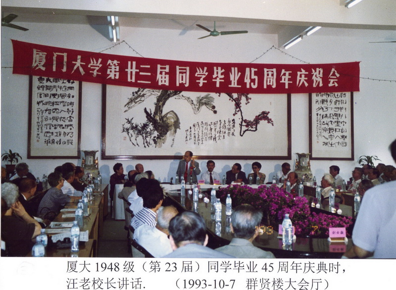 199310月,我们1948级级友在母校群贤楼二楼大厅举行毕业45周年庆典,邀请所有教过本级的教师参加,而汪公则是唯一坐在主席台上的贵宾,并请他致辞。典礼后,所有参加者在厦大大校门前拍团体照,汪公当然是被恭请坐在第一排的中央;到了下午,我们每一学系同学都轮番与汪校长在群贤楼前合照,大约拍了十几张,汪公在烈日下仍欣然就座。