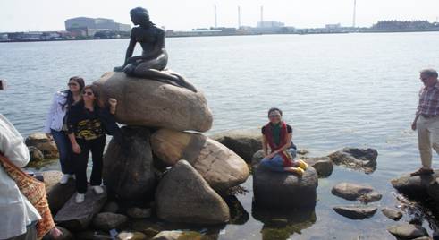 清晨,阳光温和。我们一行来到了丹麦最著名的景点——美人鱼铜像,安徒生《海的女儿》曾感动了世界上无数的孩子。这个位于哥本哈根长堤公园的美人鱼铜像在海边的一块岩石上,远远望去,铜像很小,小的在视线中几乎可以忽略她。铜像高约1.6米左右,这是一个满怀心事的少女,静静地坐着,沉郁的神情让人心碎。这座铜像是故事中美人鱼的鱼尾化成了人腿之后的形象。铜像是由丹麦雕刻家爱德华艾瑞克森铸塑的,至今已有90多年的历史。铜像在不同的历史时期也经历了诸多磨难。铜像旁围满了等待与美人鱼合影的游客们。