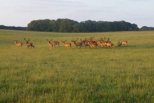 皇家猎场入口不远处有一片湖泊,几只美丽的白天鹅及成群的野鸭在湖中畅游,给平静的湖面增添了不少的生趣。白天鹅是丹麦的国鸟,丹麦人对白天鹅有着特别的偏爱,安徒生在《丑小鸭》的故事中,就把丹麦誉为“天鹅之巢”。猎场南边被一片静谧的树林围绕,一群梅花鹿静静地站在荒野里十分警觉的注视着我们,长长的鹿角展示着雄鹿的威严。微风拂着泥土散发出青草的芳香,草丛中不时传来夏虫的叫声。这曾经的皇家猎场像一片辽阔的草原,偶尔在身旁经过的丹麦人礼貌友好的跟我们打着招呼。不知是谁惊动了栖息的鸟儿,只听一阵呼拉拉的振翅声伴随着惊慌的叫声,整个鸟群掠过头顶,在金色的夕阳下振翅高飞,壮观之极!远处的湖泊,青青的草场与野生动物们融为一体,整个猎场在夕阳下显得是那样的安然,详和。这异国的黄昏似一帘幽梦,让人迷恋着,沉醉着……