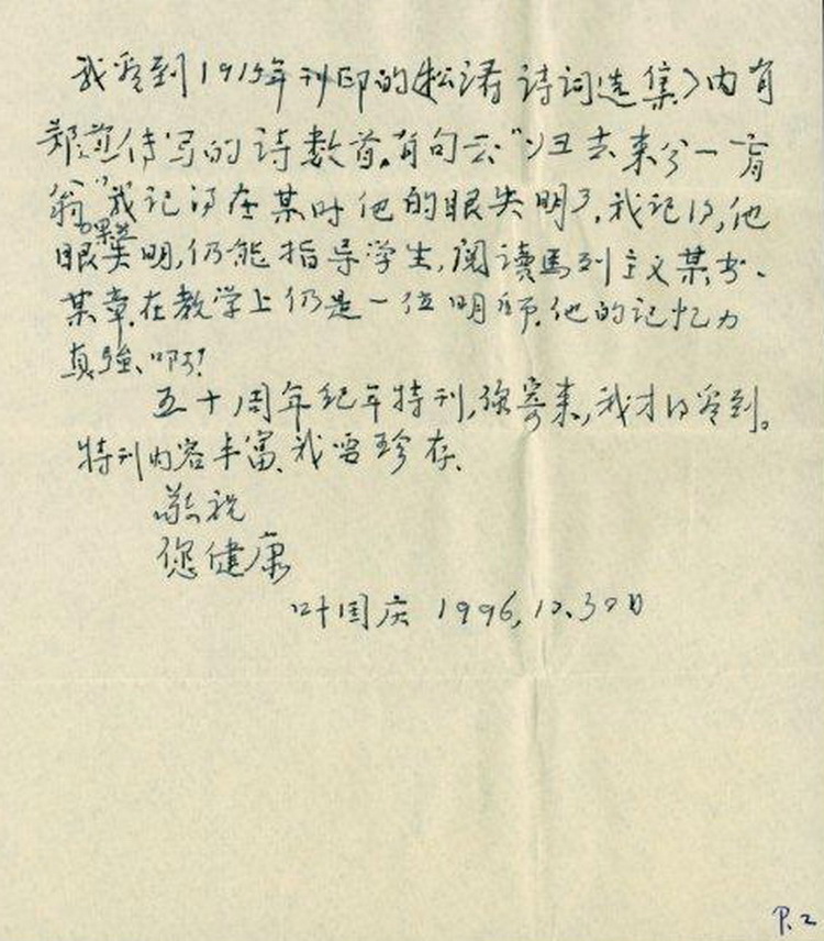 在家母的抽屉里,珍藏有她的老师叶国庆教授的信函两封,这两封信都是1996年实寄的,年代并不久远,但信件连同信封、邮票、邮戳都齐全,因而犹为难得,特别是书信中的内容,牵涉厦大长汀往事,由此更显得分量不轻。