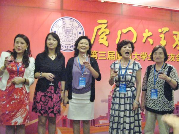 欢迎晚宴的各项仪式结束后,整个宴会厅中“问候声”此起彼伏,人群川流不息。舞台上不时有人高喊:经济系的来照相、计统系的来照相、化学系的来照相……,住过芙蓉楼的来照相。当美丽的郑冰冰秘书长热情地喊出:“住过丰庭楼的来照相”时,由于台下声浪太大,加上许多年轻女校友后来都集中住到石井楼去,所以台上只留下曾经住过丰庭楼的“五朵金花”。