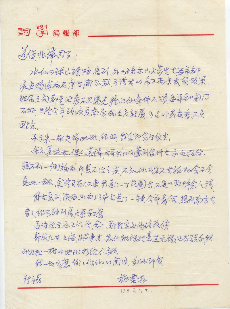 最近我在捐赠父母亲的老书旧纸里发现一封施先生1983年的亲笔信,该信用的是《词学》编辑部的稿纸,该刊由施蛰存亲自筹划创办,1981年11月创刊,据悉他“将创办、编纂《词学》视作自己学术生命的一部分,与文学创作和学术研究同样重视。”1施老在信中侃侃而谈,提及40年前的老学生如数家珍,如叙家常,整封信的书写笔迹娟秀,字字珠玑,满满一纸,一气呵成,字里行间展露出改革开放初期施先生的生活和工作情况,以及那正在穿透阴云的时代阳光: