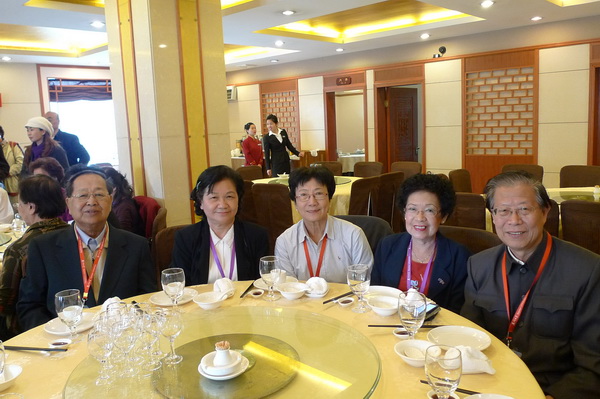 出席厦大90周年校庆的马来西亚代表右一二为郭南昌伉俪,左一二为王慧英及其夫婿,中为作者。