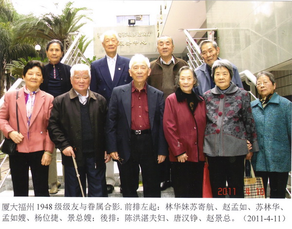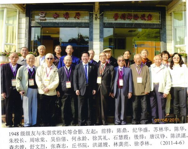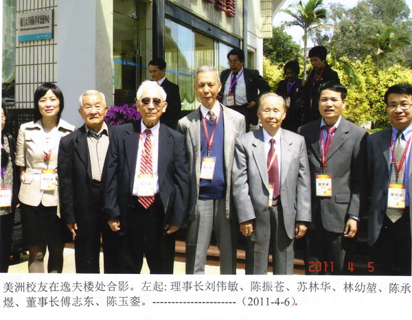 按:我4月4夜飞抵厦门後、即见到当天厦门日报第2版上有名记者余峥采访傅志东学长之报导、标题为“六位元老级校友将从美国返母校------平均年龄85岁以上、来自美洲校友会”。承列入”元老级”者、当为庄昭顺(1946年毕业、法律系、89岁)、朱一雄(47级、中文、88岁)、陈承煜(46级、会计、足87岁)、林幼?(46级、土木、87岁)、陈振苍(47级、土木、足85岁)及我(苏林华、48级、机电、足84岁);但到校时、增了在厦门入学、1949年政治系毕业之张德光、年龄也在85岁上下。至於美洲其他校友、我除傅志东、刘伟敏及王奋、陈玉銮原己认识外、现加上王宝华、李梅及多位随行之夫人小姐们。