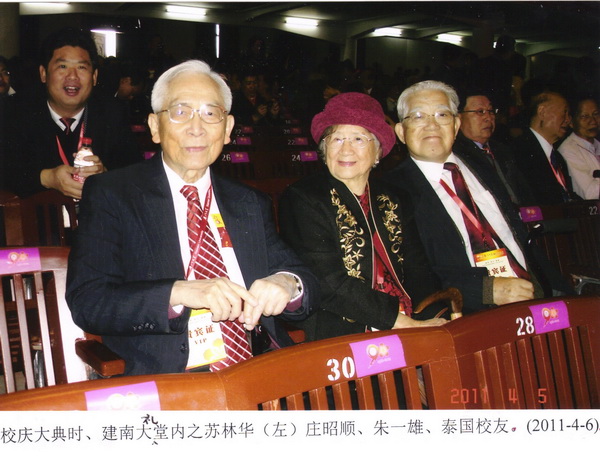 7:40左右、交通车送我们到建南大会场,志愿者何琪即带我到中央位置处之第22排、她则立在右侧门处可随时连络。这时我发现、後面一排坐着多位泰国旧友、即为泰国校友会前两任主席张永青与张祥盛、及现任主席张祥裕等。不久、朱一雄与庄昭顺夫妇由其两女及刘伟敏学长以轮椅推进会场、与我同坐一排。由於很吸人注意、故次日厦门日报第3版便把他俩唱校歌时之特写镜头刊登出来。