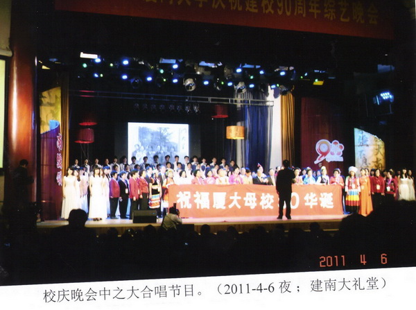 夜七时许、我们搭车到建南大会堂参加称为< 南强颂>之“厦大庆祝建校90周年综艺晚会”,仍由志愿者何琪替我们找了靠中央的位子、但朱一雄夫妇则乾脆坐在中央通道之轮椅上。晚会在夜七时半开始,起初有萨本楝校长在家中开课授徒、及陈景润攻读不懈的话剧式表演,不太像、但其寓意则可取。第13个节目是美洲校友张德光女公子张安麟教授之钢琴独奏两曲;第15个节目为泰国校友之歌舞”美好的祝愿”;第16个节目为泰国校友会前任主席陈汉涛、张永青及秘书长曾心共同作词的”校友之歌”、由厦大学生合唱团与泰国校友联合演唱的;这三项演出都博得广大掌声、我也都拍下照来;後者我後寄去泰国。按: 我之所以特别关心泰国校友、是因我曾应聘该国17年半、与他们相处良好、且现尚是该会荣誉主席之故。校歌大合唱毕、晚会闭幕,振苍兄与我由何琪及另一志愿者送回;他们明天恢复上课。