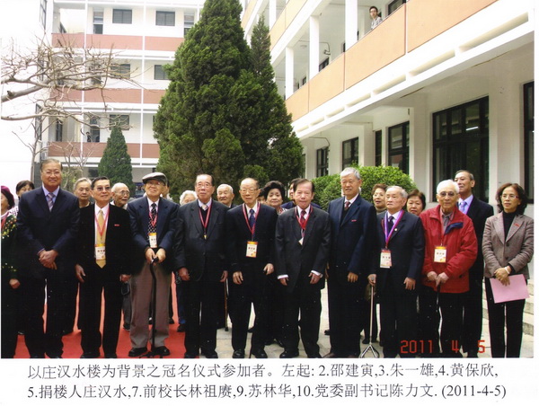 下午四时、因四十年代之旅菲庄汉水学长捐资250万元人民币,校方特将原“南强二楼”改名为 “庄汉水楼”、因而有此冠名仪式。3:40前、何琪同学陪我们搭交通车去现场、由於时间还早、外方寒风阵阵、故来宾纷入楼内教室暂坐、这时我得与许多故旧重唔。其中有十年前、八十周年校庆之次日同车去长汀访旧之香港名校友黄保欣学长(45级、化学)、他还记得当时我送他< 苏林华文集>事。另有前校长林祖赓博士、14年前我曾应其邀、在77周年校庆升旗仪式中对数千学生致词、他便是其时主席;他退休後、我们仍经常在各种会议埸合上聚唔,他对《机电通讯>等校友通讯刊物均常浏览、承他关注其上对我体况及在美生活及欧游之报导、至感!又、仪式刚开始时、我向立於左旁之党委副书记陈力文致意、提及14年前在升旗仪式中曾经同台过(其时她任林祖赓校长之办公室主任)、她即忆及。