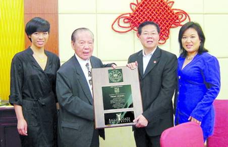 我为庆祝母校的九十周年在美国特别设计制造一个铜匾以作礼物给母校做纪念,由朱校长亲自接受,上面有母校校徽,下面有我任教大学的校徽, 中间是中英对照的贺词,英文动词都用进行式(ing),以表生动。