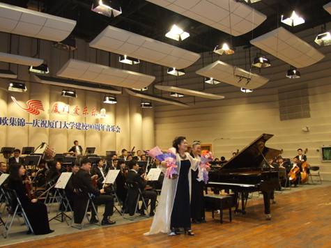 第二次是四月十五日晚上,是厦大九十周年庆贺的压轴。是在厦门市的音乐厅,由厦门爱乐乐团举办的音乐会特别演出。听众满座。有远从上海,杭州乘飞机来厦门,以及我的出生地长汀县的领导代表七人,和厦门市潘世建副市长等人,就是要听张安麟的演奏。