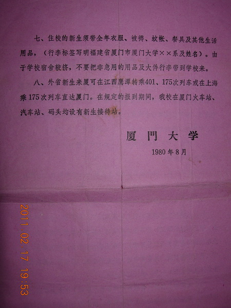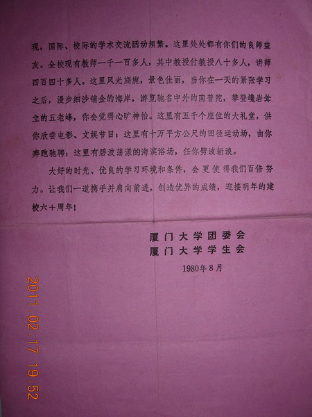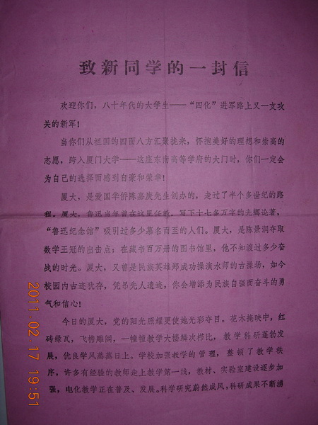 今天元宵,回家探望母亲。饭后,闲话间无意中提及当年很多东西现在都丢失了,包括我的录取通知书之类。母亲听了,连说没丢没丢我都保存着。于是就要去翻找。我说你别动说说就是,母亲回答说说没用我也不知道在哪里。走到书橱,取出一本比我年纪还大十几岁的厚书,从书页中翻出一叠纸,其中就有我找了一年多未见踪迹、31年前随高等学校录取通知书一同寄到的厦门大学团委会、学生会《致新同学的一封信》。就是这篇留有语病和错别字的信,是我们当年读到的最美妙、最撩拨人心的文字。很长的一段时间,都是我们理想的风帆和前进的号角。