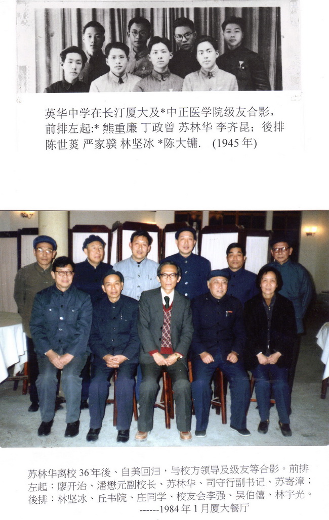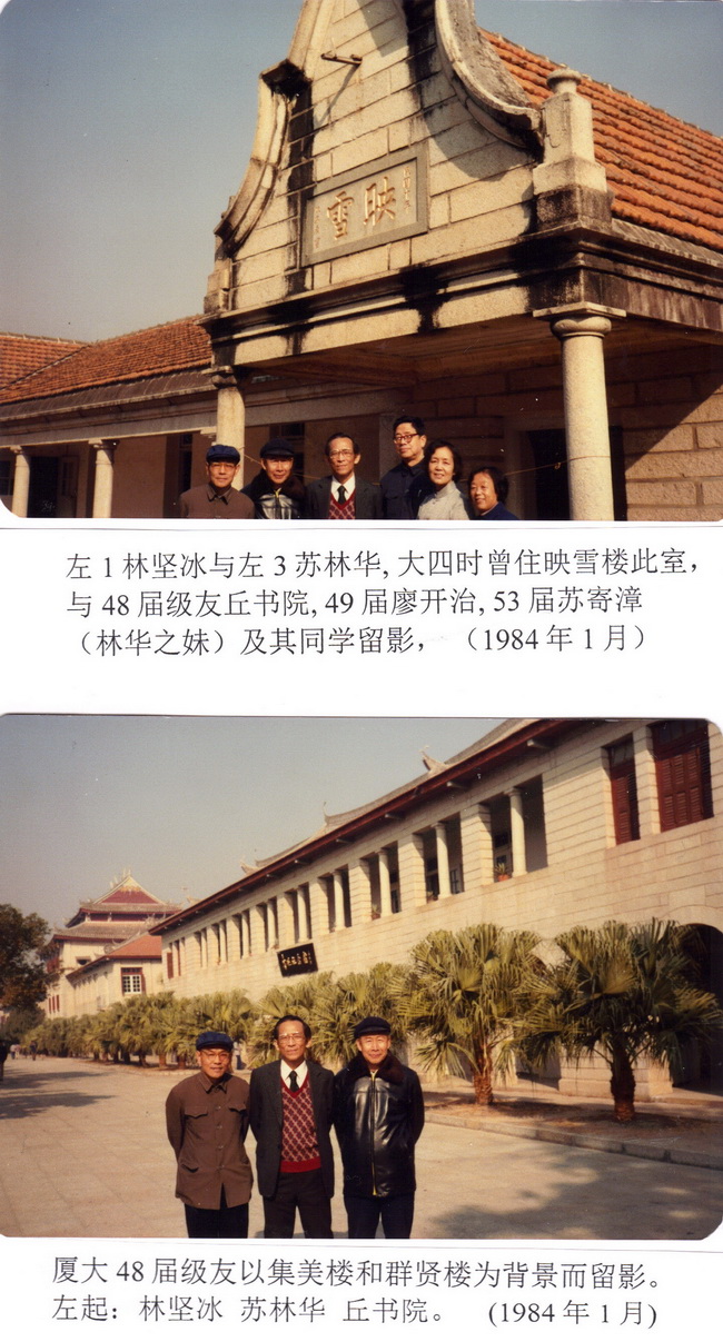 一时间里,许多往事涌上心头。遥忆1944年我们从英华高中毕业时,全班72 人,进入厦大者计6人。其中陈世?(机电)读一年後转学中正医学院,三十多岁时在国内病逝;丁政曾(会计),1999年时在泰国病逝;李齐昆(机电),2009年时在美病逝;林坚冰(数理)则为第四人:如今只留下在奥地利之严家?(土木) 与在美之我(机电) ,思之惘然!
