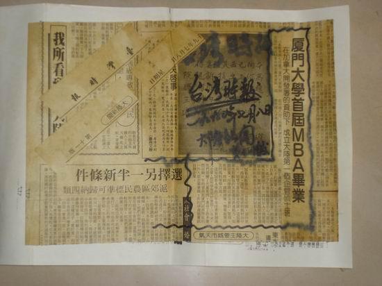 1990年圣诞节,应台湾高雄一位移居到澳大利亚的好友邀请,到他家作客。在他家的咖啡屋(COFFEE BAR)里,发现他家抽油烟机傍的墙上贴着一张沾满油汁的《台湾时报》,上面豁然写着这样的一则大陆新闻:主题是 “ 厦门大学首届MBA毕业,”副标题是“在加拿大开发暑的资助下,成立大陆第一个企管硕士班。”出版时间:民国七十九年七月八日第十一版大陆新闻。详细地阅读信息内容后 ,我对主人兴奋地说;这就是报道我在中国所在的MBA班的毕业状况。它对我来说如获至宝,但对主人来说可能一文不值,很显然主人是用来防污用的;并且可能已经贴了很长一段时间了,报纸已经有些发黄而且渗满油埚。征得我朋友的同意,我小心翼翼地把此则信息内容和报纸的标识从墙上拆下来,并特地在报纸上加上附注说明,一直珍藏至今。