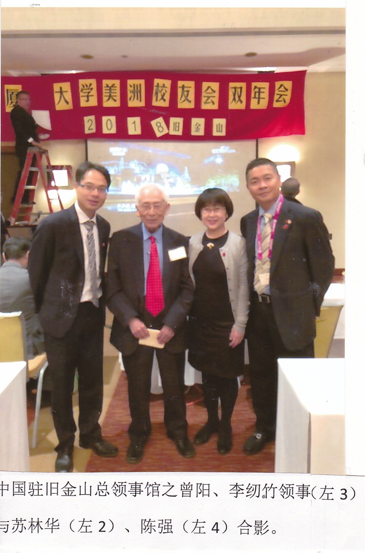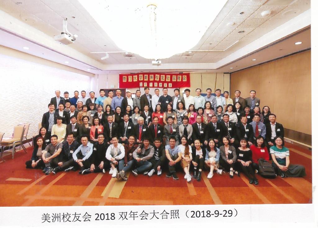 最後,全体近百名与会者分成四排,以“厦门大学美洲校友会2018双年会”大红布条为背景、合影留念。