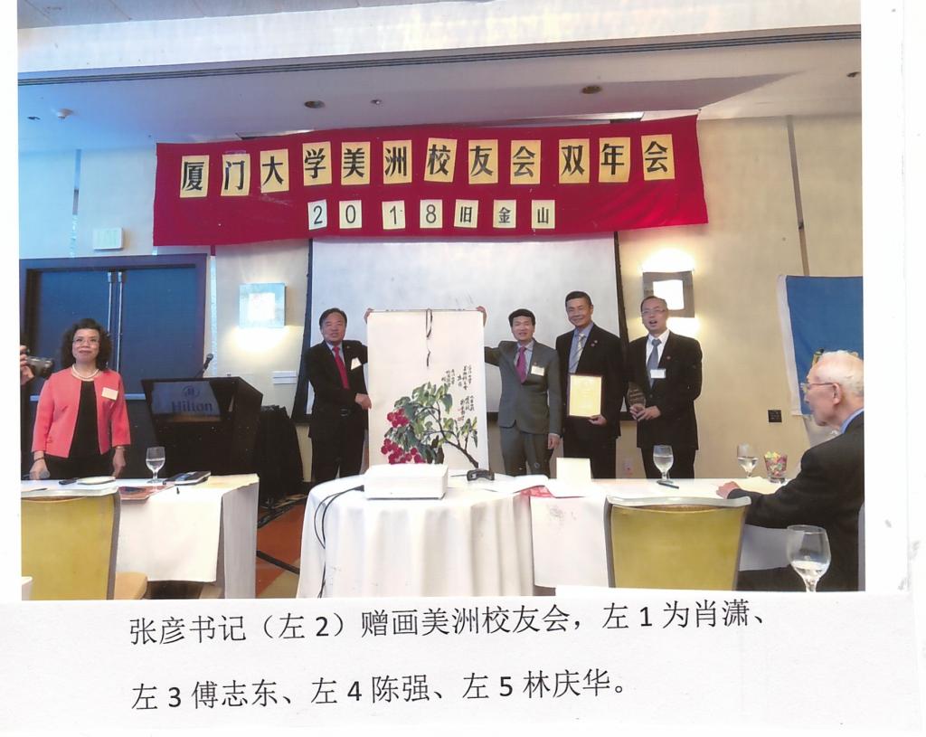 繼由母校党委书记、也是校务委员会主任张彦向卸任理事长林庆华颁发“厦大校友服务奖”,向新任理事长陈强颁授理事长牌,并向美洲校友会赠送一巨幅国画,由傅志东董事长代表接受。