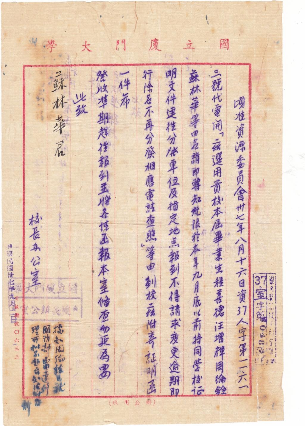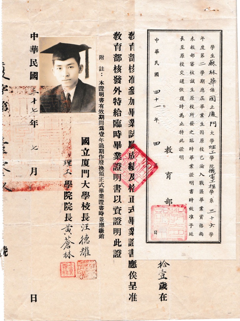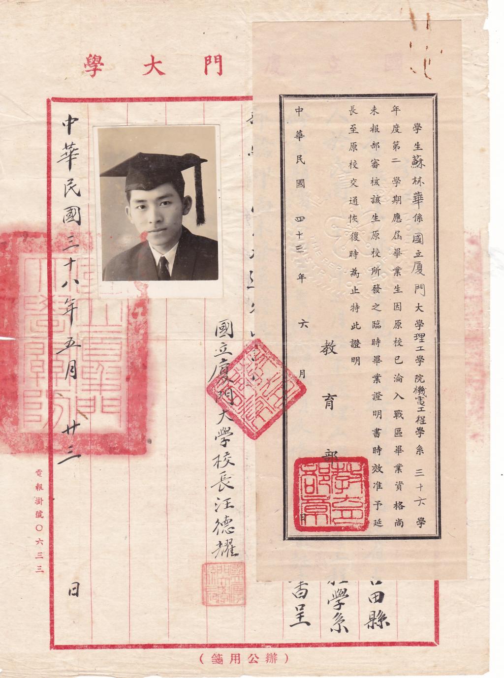 其时国内内战方殷,在此期间,我预知可能发生的情况,即今後我就业在台湾,故在民国38年(1949年)5月向厦大校方申请加发不具 “临时毕业”字眼的 “证明书“,承教务处在刻有 “国立厦门大学” 字样的信笺内、用毛笔写出证明书,内容如下(请参看附件):