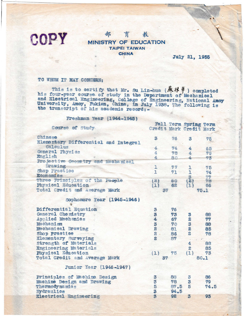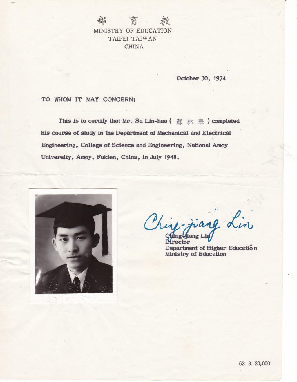 上示之修业证书 (成绩单) 經呈文教育部,申请发给我英文证件。經先後在1955年2月14日取得教育部高等教育司司长孙宕越(Sun Tang-Yueh)颁发的英文毕业证明书与二页英文成绩单;其後、1974年10月30日时,又由後任司长林清江((Chibng-jiang Lin)) 颁发一次英文毕业证明书。-----现将三者均附于此。
