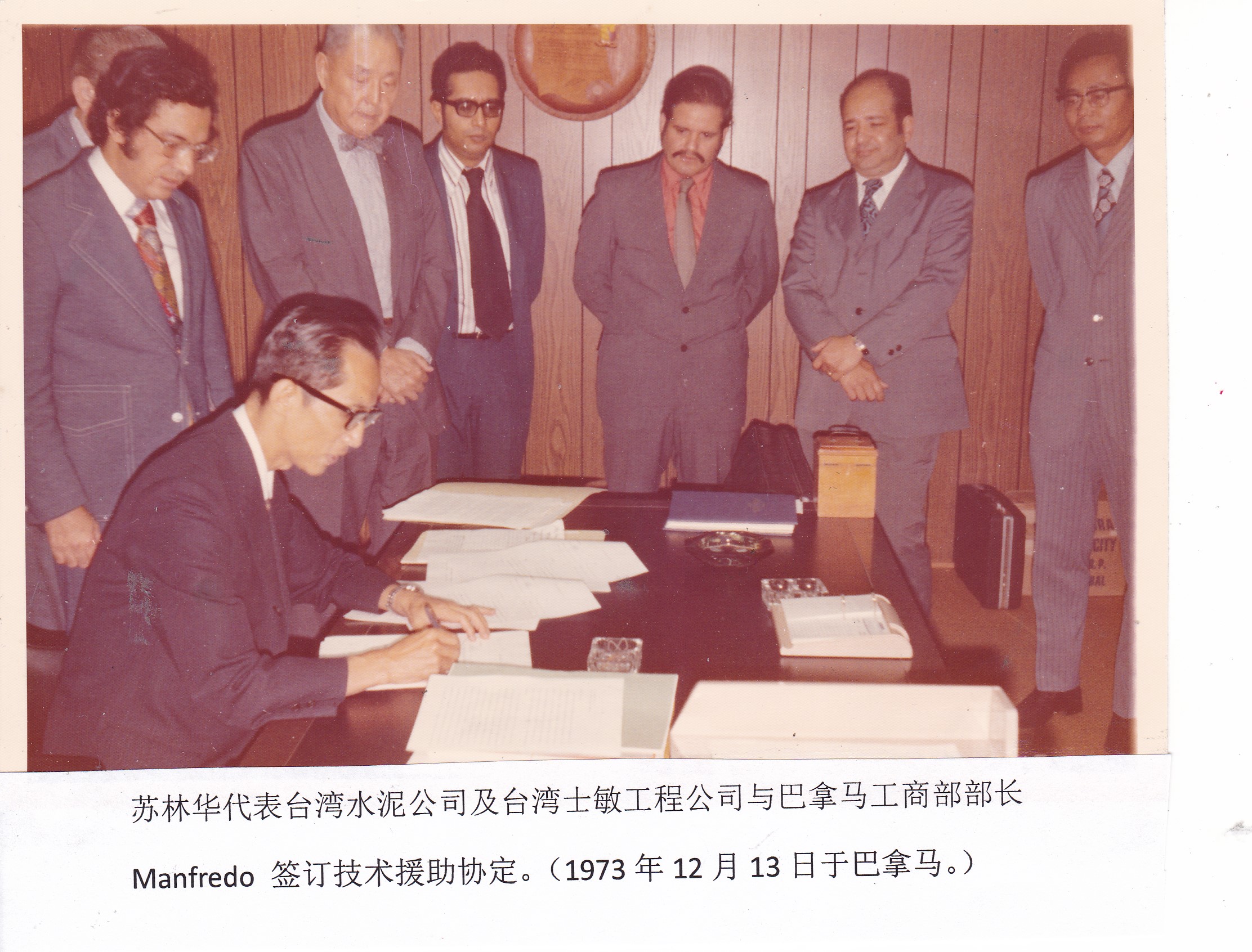 我在1948年夏、自厦大机电系毕业后,由行政院资源委员会选送到台湾水泥公司工作,开始了我一生长达59年的水泥生涯。我在台泥辖下之高雄、竹东及苏澳三厂、以及公司之总管理处、工作长达30年之久;其间且曾借调到台泥关系企业台湾士敏工程公司,担任其机械部经理之职。在1973年时,在台湾之中华民国政府还是联合国会员国之一,故是年11月至12月间,台泥公司应政府之邀,派我前往中美洲巴拿马为全权代表、协助该国兴建其国营水泥厂。1973年12月13日我在巴国工商部内,与工商部长Manfredo氏签定技术援助协定,由我方助其兴建一座国营水泥厂。忆签约日,巴国工商部内冠盖云集,且有我国驻巴拿马国大使黄仁霖亲临见证。是夜全国电视台全程播出简约的过程,次日当地的所有西班牙文报纸(按:巴拿马之官方文字及语言全用西班牙文)在第一版内刊出,我的签约镜头立刻呈现;继后一日巴国总统召见,我又由黄大使陪同拜候,这些都使得当地华侨大为振奋。——我居然担任了出使巴拿马国的民间大使之职务,在我的人生旅程中留下个不可磨灭的印记。