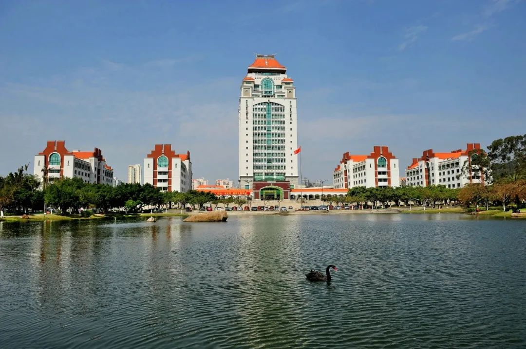 紧接着画面转换,又用两句对偶「五老峰幽,思源谷翠」从高(五老峰)到低(思源谷),用「幽」和「翠」点出厦大所处环境的优美;然后画面再转换到厦大门口的香火鼎盛的庙宇—-南普陀寺,点出这里还是佛教圣地,是游客必到之处。接着,画面再转换到校园内,又用两句对偶,芙蓉(湖)水暖,上弦(场)雾冷,点出此时虽然已经是湖水渐暖的春天,但清晨的雾还是冷的。这里再将时间拉到早上,为下一句「晨韵频惊宿鸟」,做一铺垫。拂晓,晨韵已经拉开序幕,运动场上的跑步声,运动声和湖边,海滨的读书声惊醒了树上的宿鸟。这是一所欣欣向荣,朝气蓬勃,充满希望和理想的大学。此时的我,想象着正站在厦大的高楼上,凭栏眺望美丽的海湾对岸,在海天连结处,新建的翔安厦大分校隐约可见,那里昔日人迹稀少的荒寂渔村已变成当今美尽东南的著名学府,旧颜换新貌。