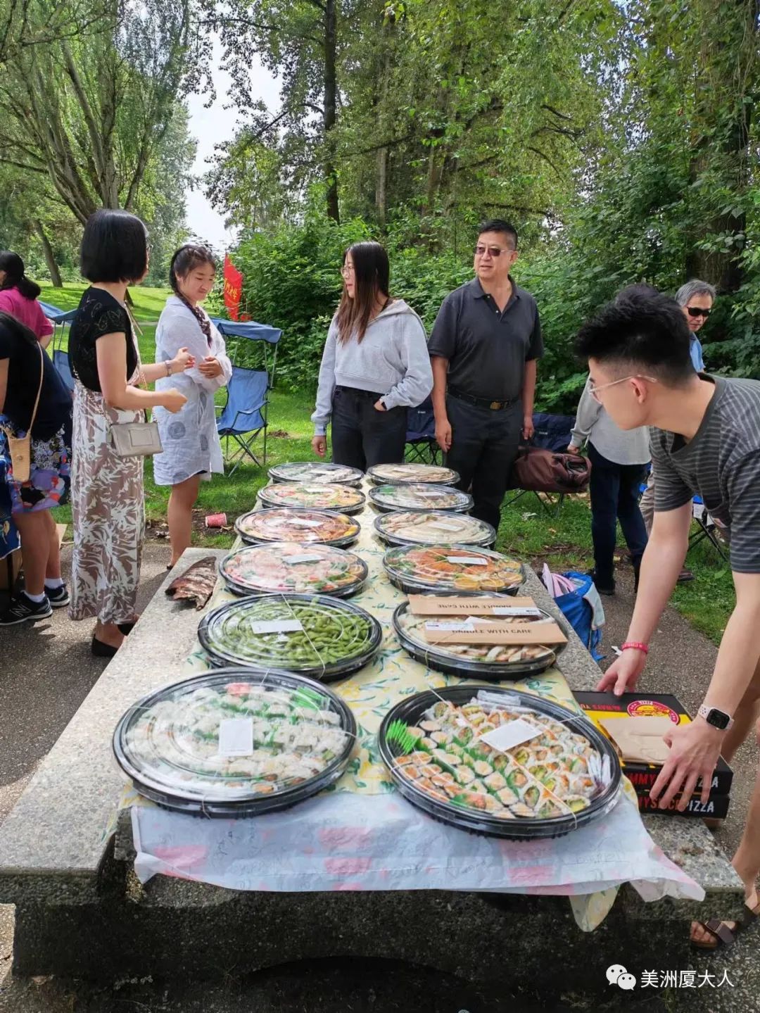 当天上午不到9点,就有校友主动去公园占位以保证活动顺利进行。12点多校友渐渐到场,三五成群,难得的见面机会,大家聊得十分欢畅。本次聚会为了减轻大家负担,食物统一釆购。在食品送达摆桌后,大家边吃边聊,兴致勃勃。