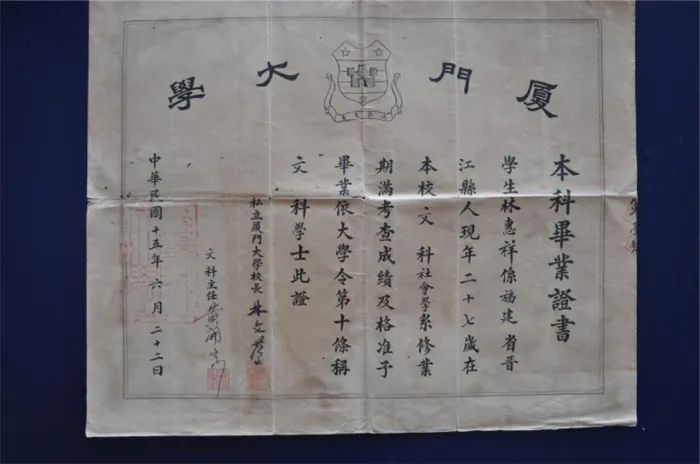 △林惠祥是学校第一届文科生第一号毕业证书持有人