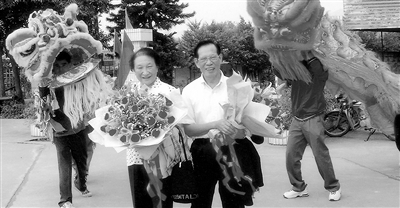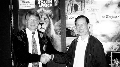 上图:黄本立(右)在第30届国际光谱会议上和南非代表合影。 左图:2004年,黄本立回到家乡,受到热情欢迎。