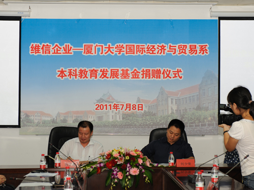7月8日上午,“维信企业——厦门大学国际经济与贸易系本科教育发展基金”捐赠仪式在经济学院举行。该基金是由我校国际经济与贸易系1996届校友、维信企业有限公司董事长何少荣捐资200万元人民币设立的。
