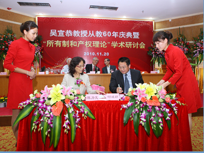 在11月20日上午的吴宣恭教授从教60周年庆典大会上,吴宣恭教育基金正式成立,校党委副书记陈力文、吴宣恭教育基金捐赠人代表何诚颖代表双方在捐赠协议书上签字。