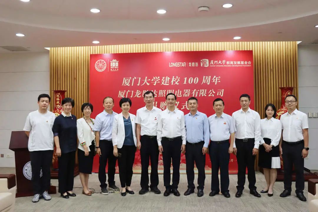 厦门大学教育发展基金会秘书长曾国斌主持捐赠仪式。厦门龙胜达照明电器有限公司总经理助理、总经办主任温伟超,总经理秘书、总经办秘书黄华珍;厦门大学实验室与设备管理处处长施芝元,学校办公室副主任洪海松,党委宣传部副部长楼红英,人事处副处长李承华,校友总会副秘书长郑辉,教育发展基金会副秘书长赵晓慧、钱陈翔等出席捐赠仪式。